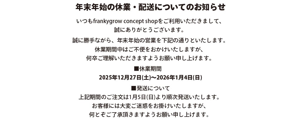 frankygrow は『simple pop。』をconcept に 展開している子供服・大人服ブランドです。 東京/ 渋谷区笹塚にある frankygrow concept shopは、frankygrowの 全アイテムを取り揃える frankygrow FLAG SHOPです。
