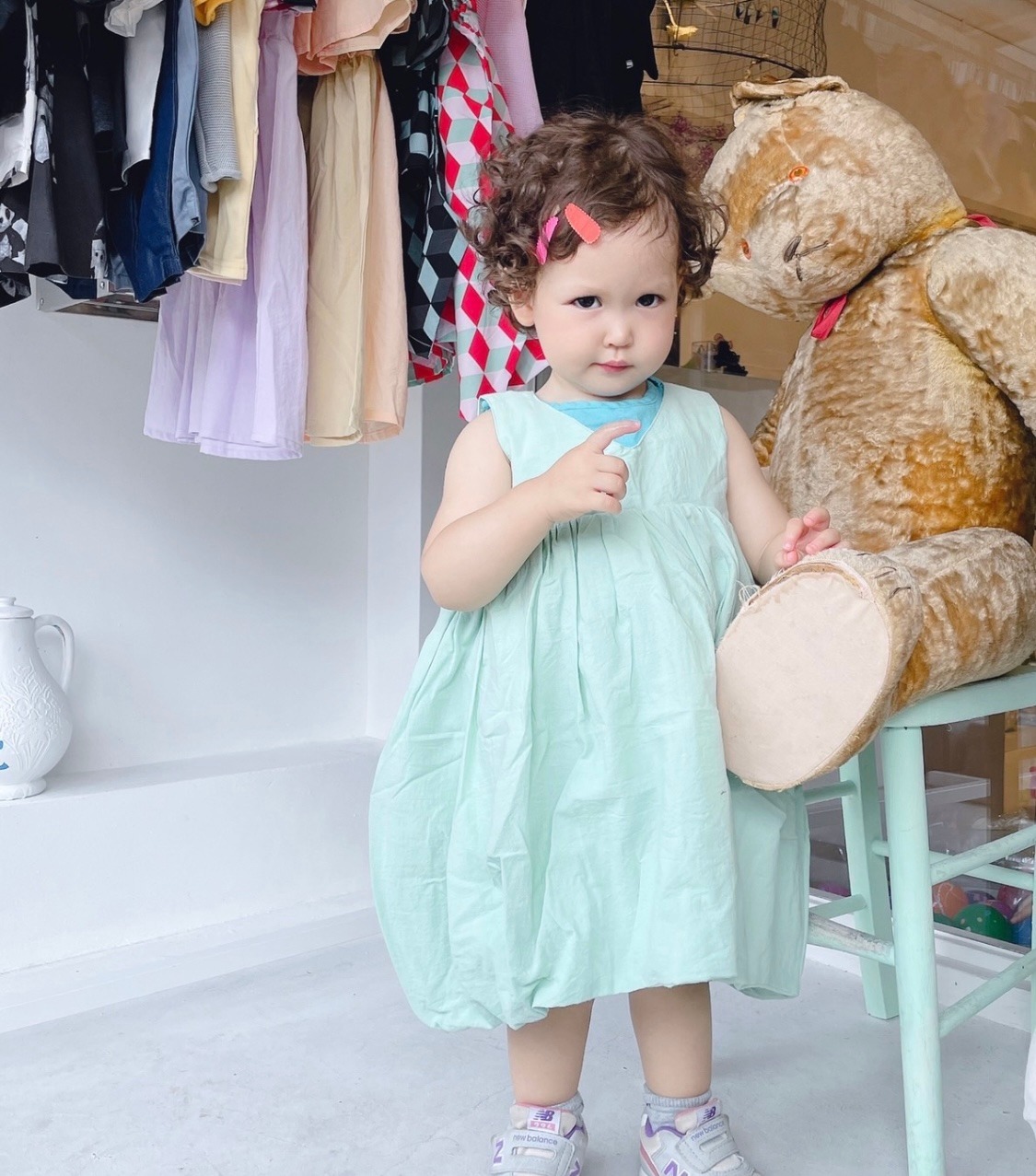 透明感あって色白なハーフのsakuraちゃんはsサイズの東炊きワンピが超絶お似合い♡♡ヘアピンとミントのお色合わせも映えています!!ママさんもおとなfrankygrowをたくさん着て頂き、お写真お待ちしております!!!