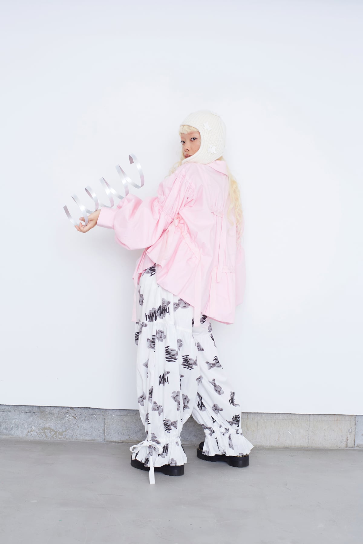 たっぷりギャザーが入りワイドシルエットなパンツ。