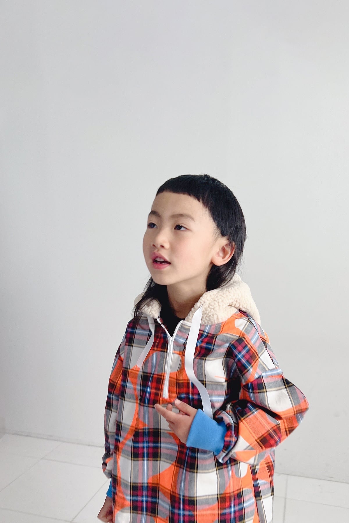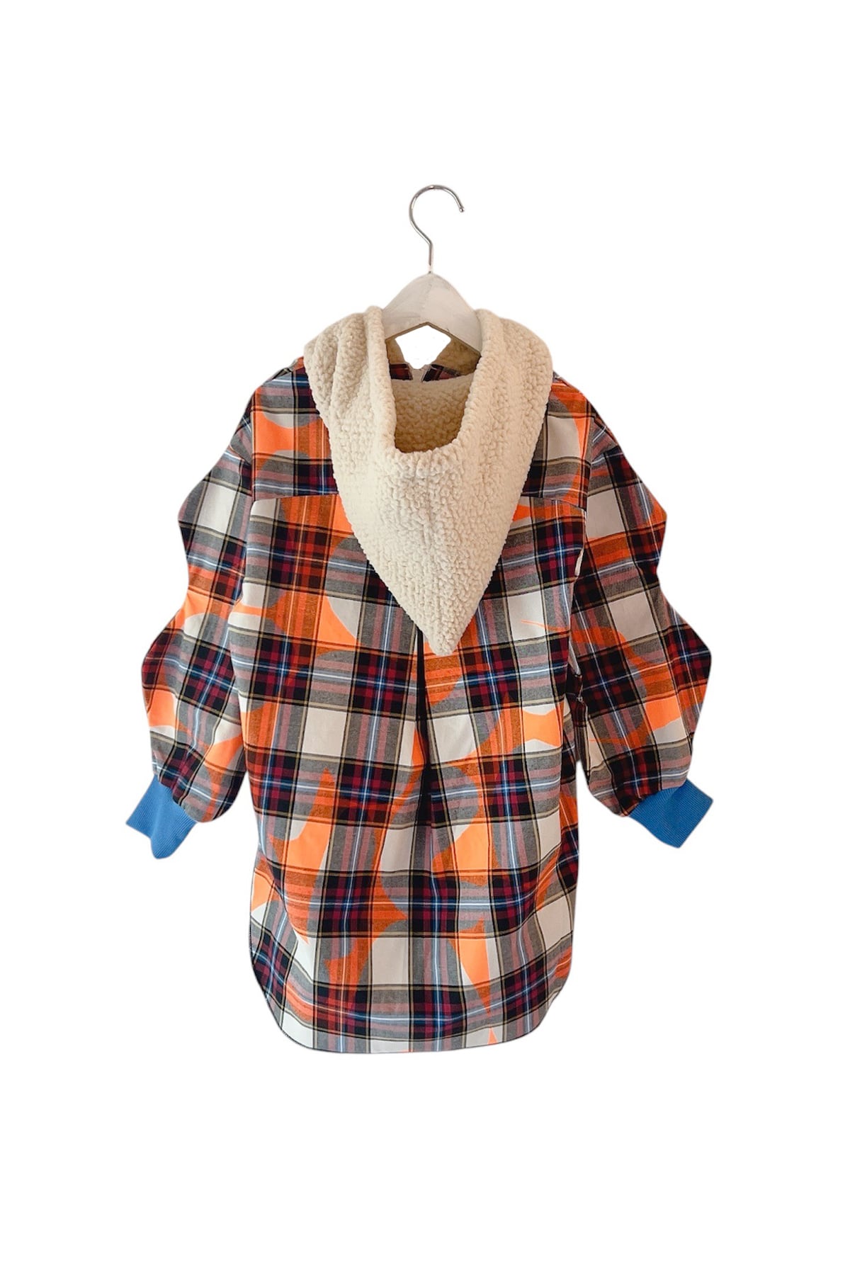 大きめなボアフードと前後の丈が違うアシンメトリーヘム