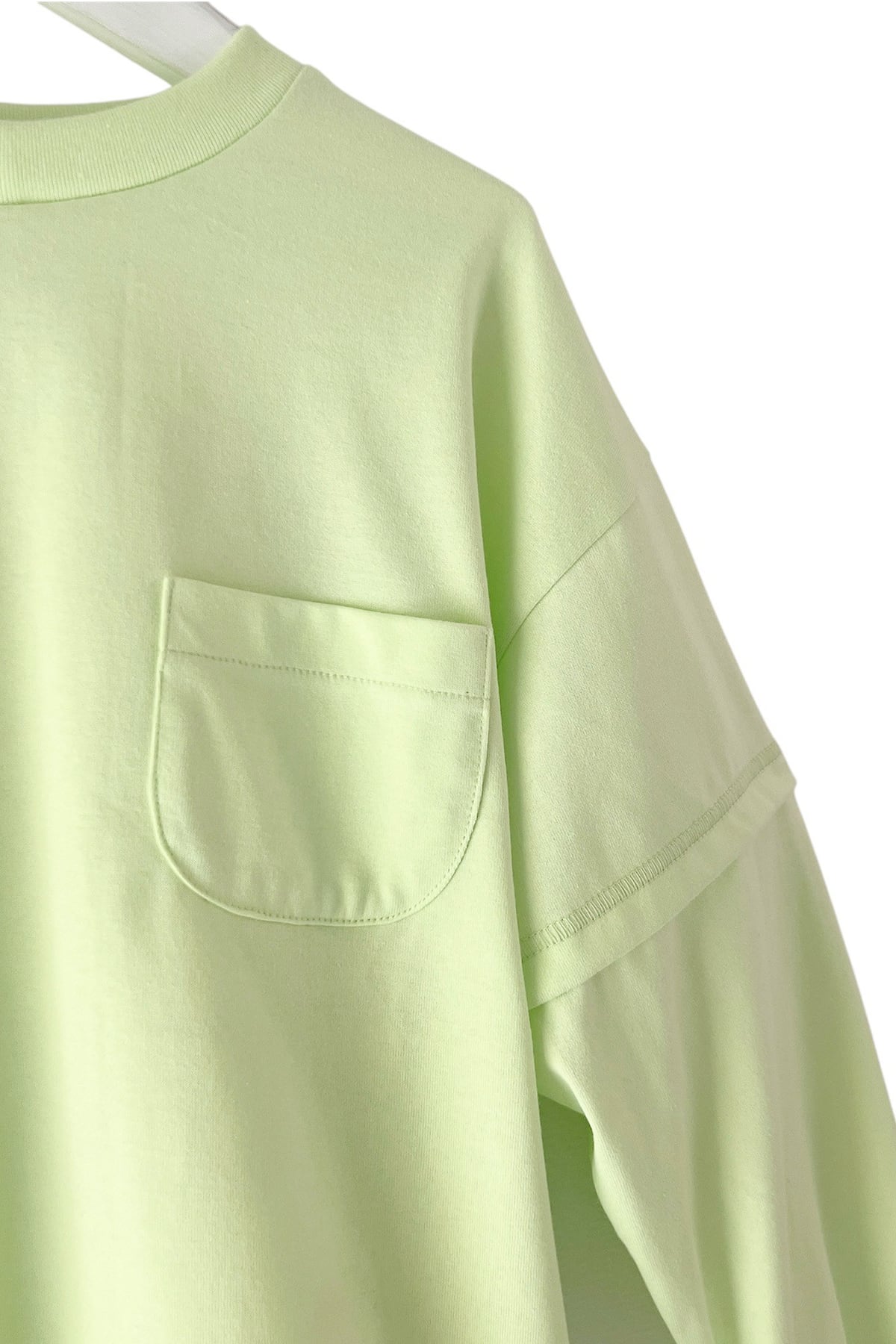 ネック部分の段差をつけたリブ、袖部分はレイヤード風になっており、