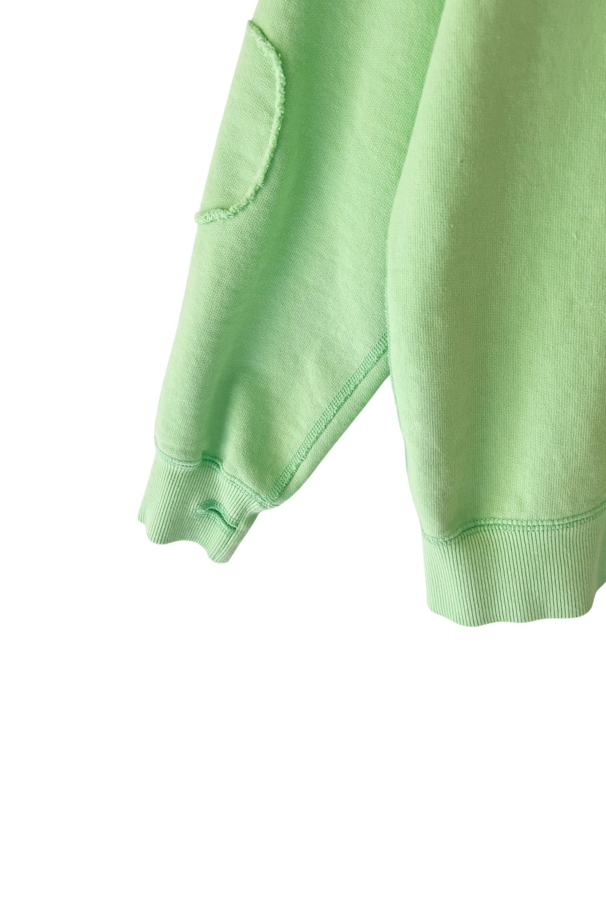衿は段差リブ、断ち切りのエルボーパッチ、サムホールと