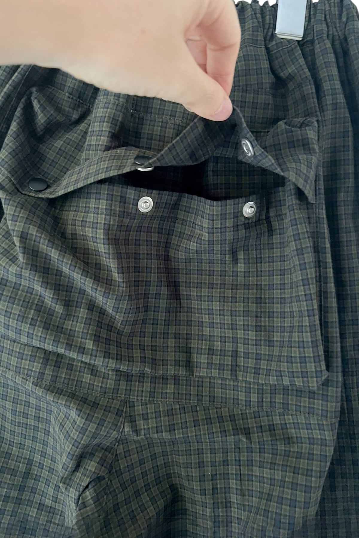 後ろの大きな立体フラップポケットが印象的なパンツ。オーガニックミニチェック生地を使用。厚すぎず薄すぎない丁度いい素材感。