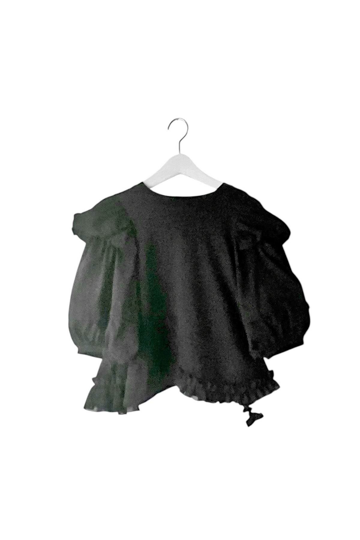 とんがりしたボリューム袖がポイント。短丈デザインのトップス。