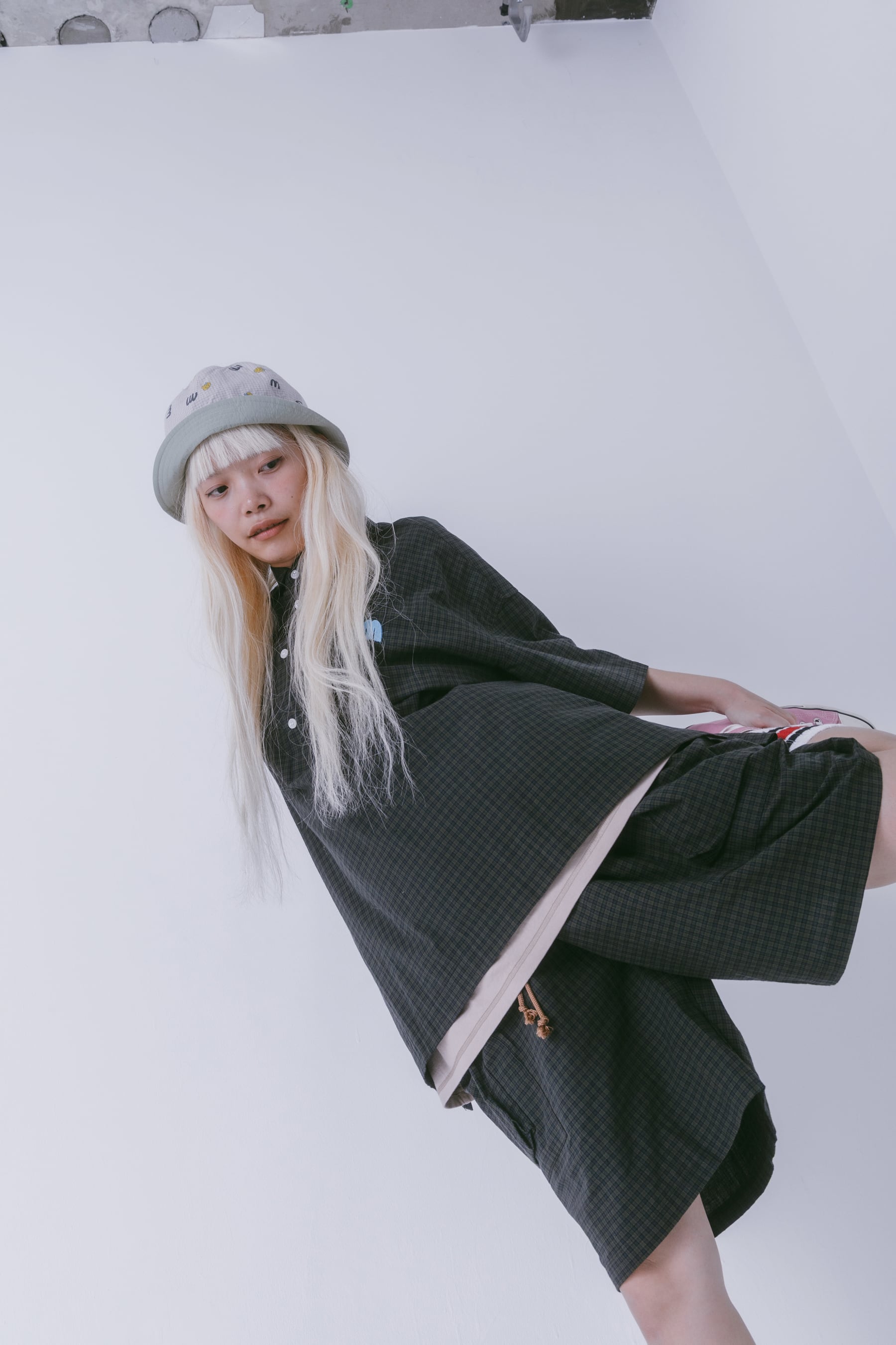 タテ・ヨコともに綿の60/1のコンパクト糸を使用し、高密度で練り上げたタイプライター生地のグラフチェック柄にプリント。