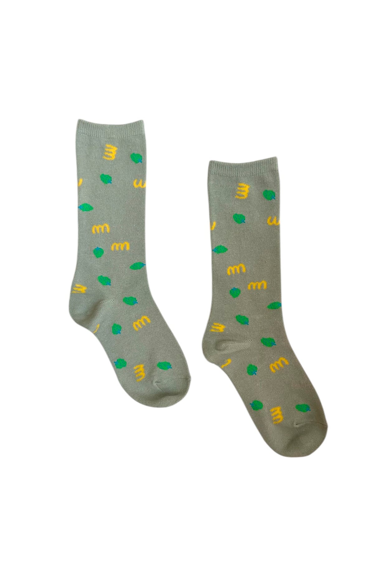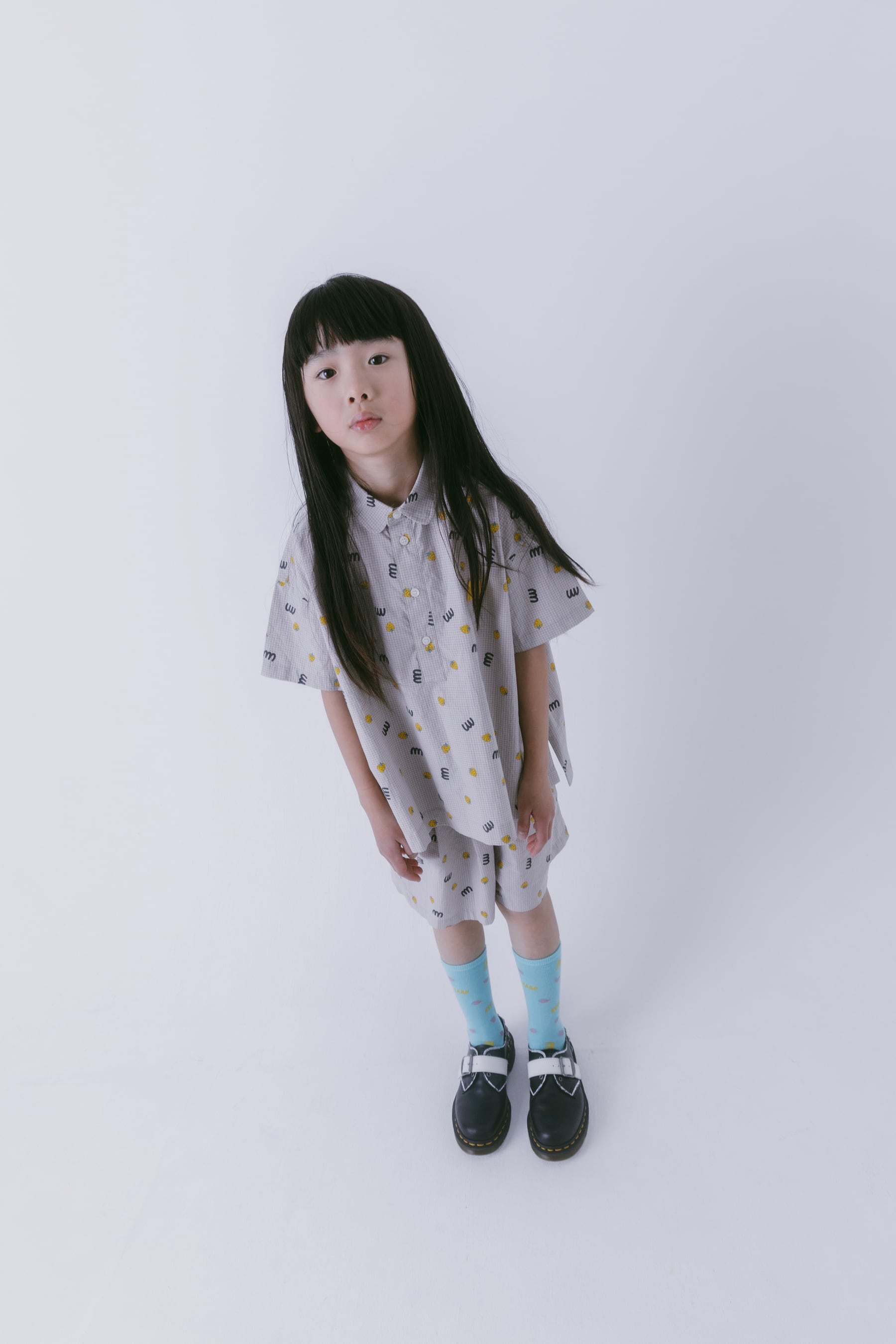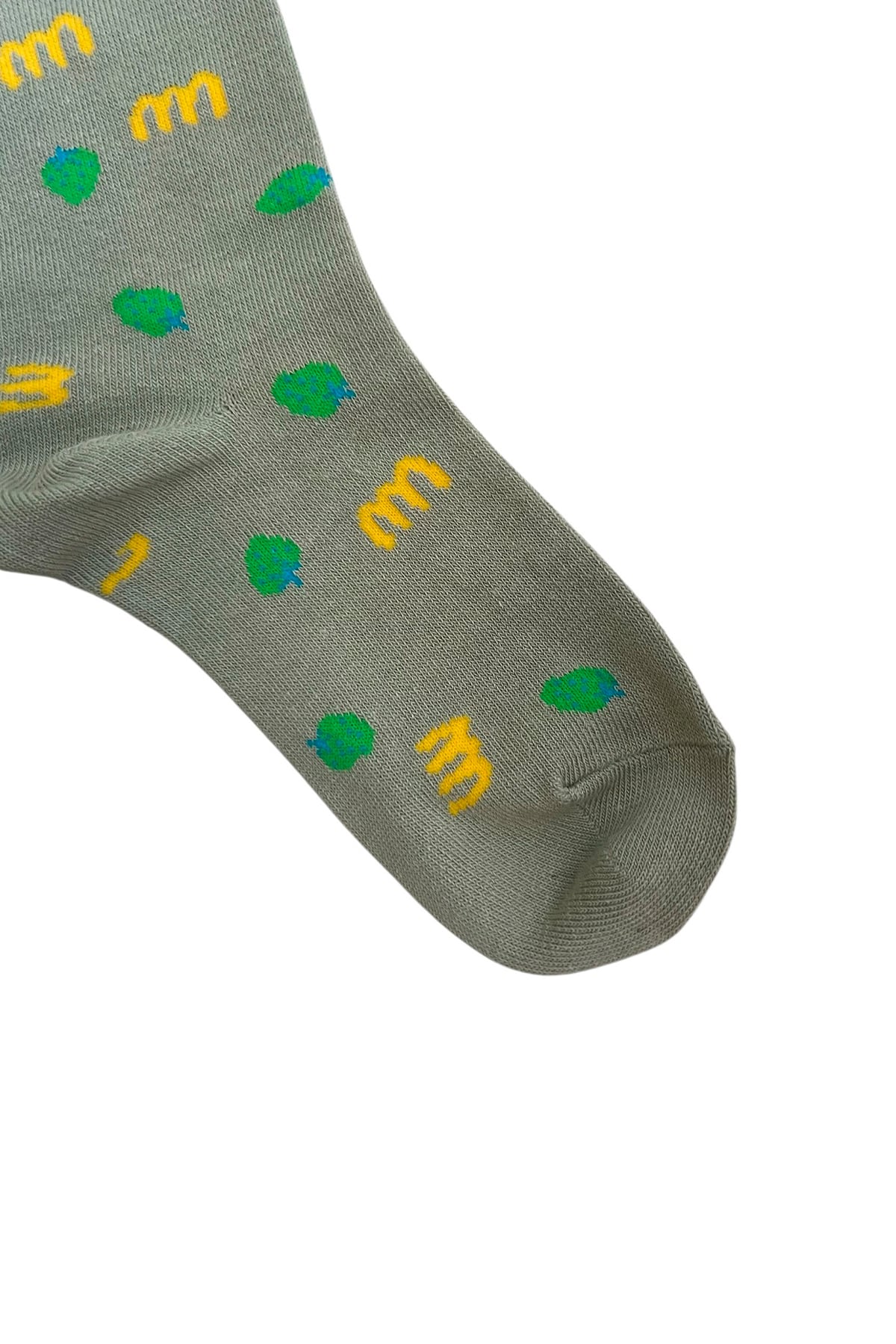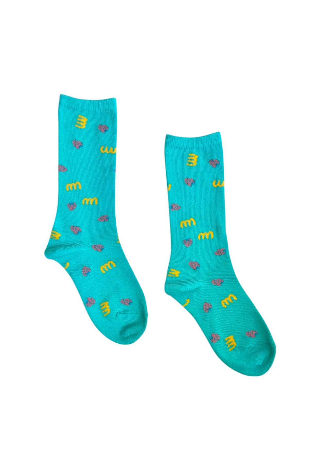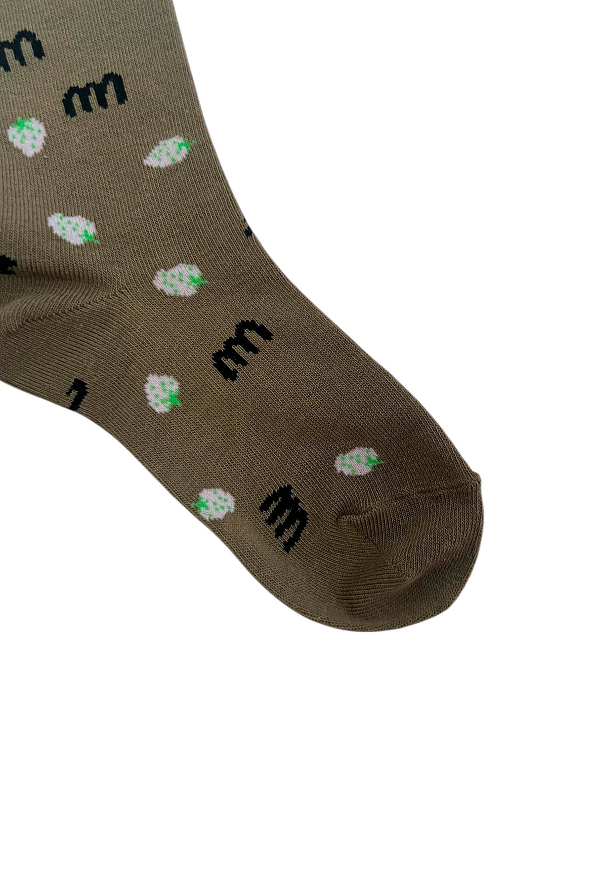minnanoのロゴとイチゴの総柄ソックス。