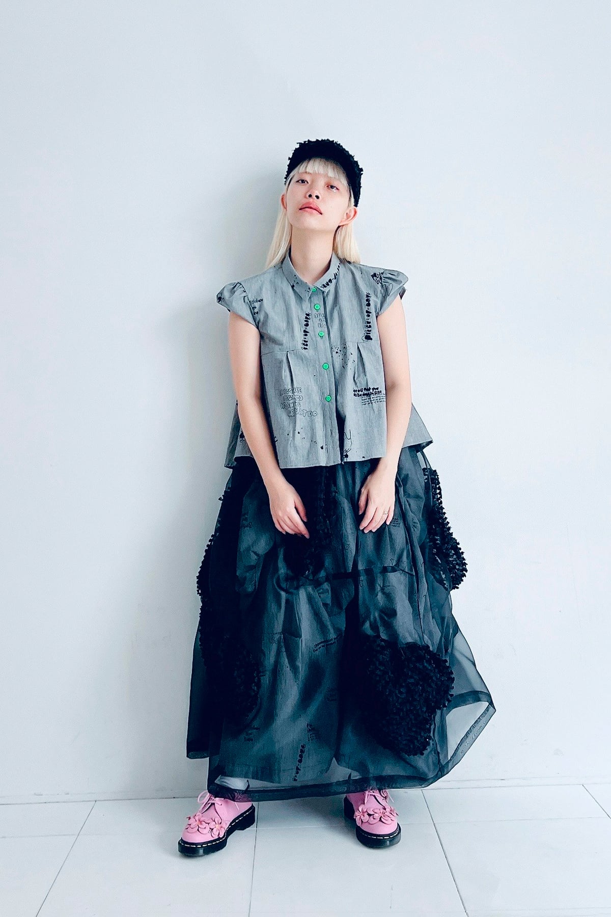 前たてに挟み込まれたオーガンジーと蛍光ボタンがポイント。